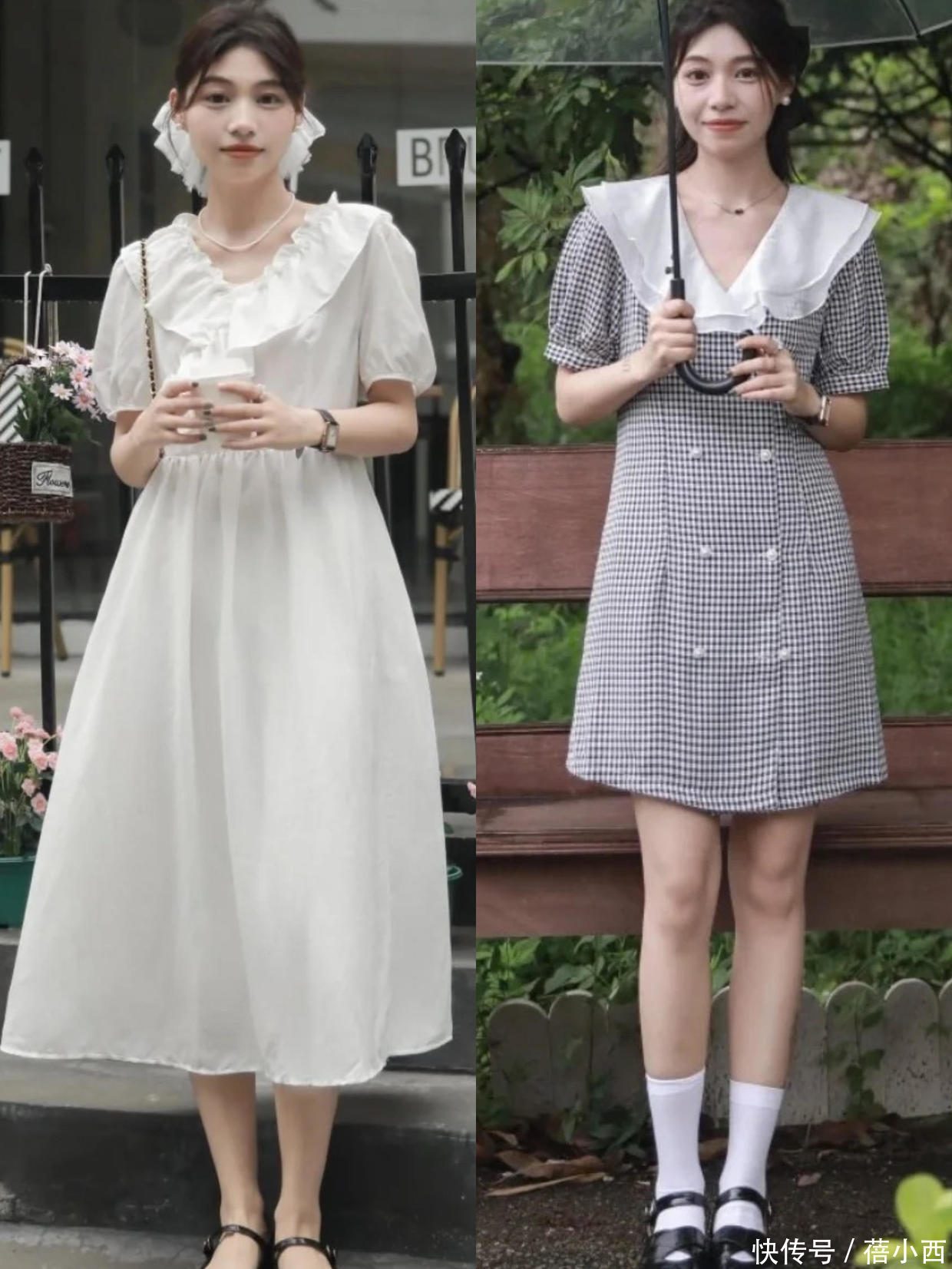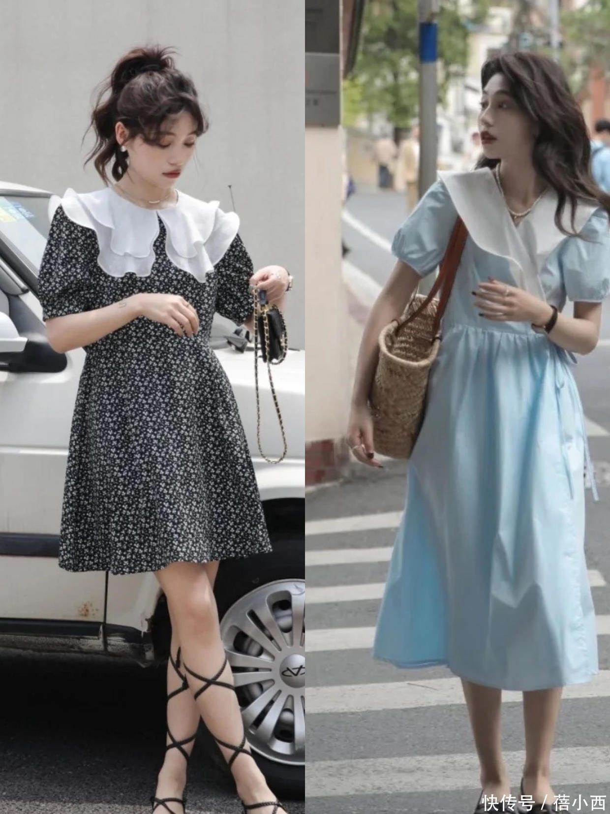 第一款是本年流行的娃娃领连衣裙,这种连衣裙很相宜年青女孩,穿在身上减龄的遵守终点好。